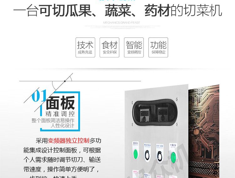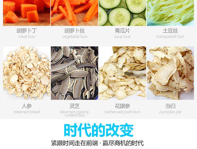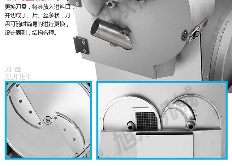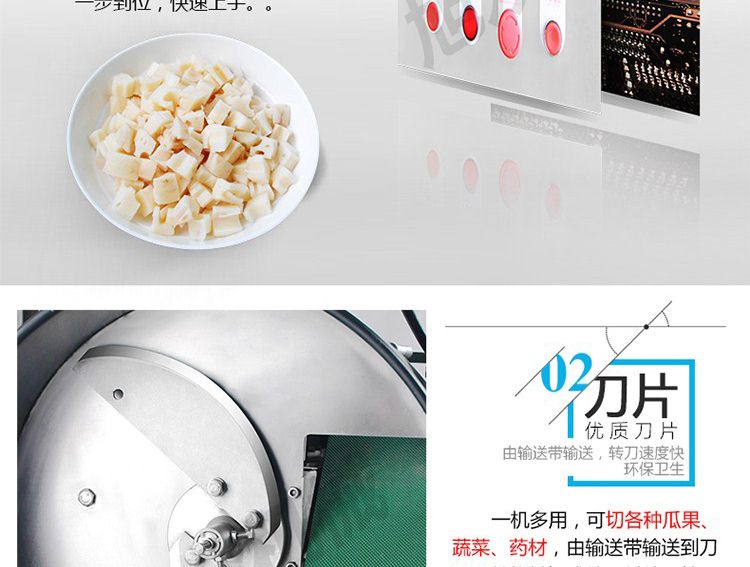 一機多用,可切葉菜及根莖類蔬菜,并可切片、絲、條、丁、段,碎等;根莖類,成品形狀:片、四角絲條、丁、斜片;葉菜類,切割尺寸:1-30mm可以調(diào)整。