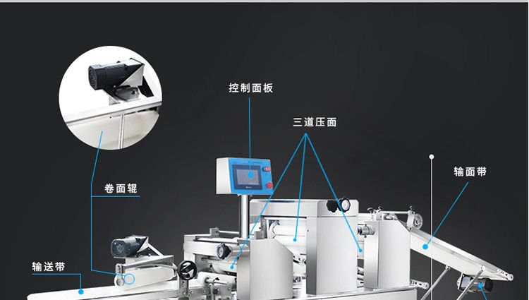 ?生產(chǎn)速度快,效率高,生產(chǎn)流程流暢,各環(huán)節(jié)都輔以電控設(shè)備控制,不會(huì)出現(xiàn)堵面,破酥等現(xiàn)象;